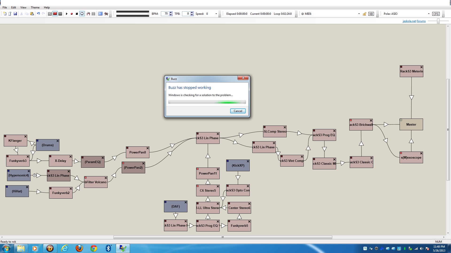 Joachim being able to save that project was just a short phase and again I'm not able to make it. every time I press save button it gives me a note that "Buzz has stopped working" and close it down. I will attach a screen shot of the session and just in case I removed any KFlager, EQ-10, HD Bguitar but still not able to save the project. (is there any way or special software that can help to find out what is bugging buzz?)