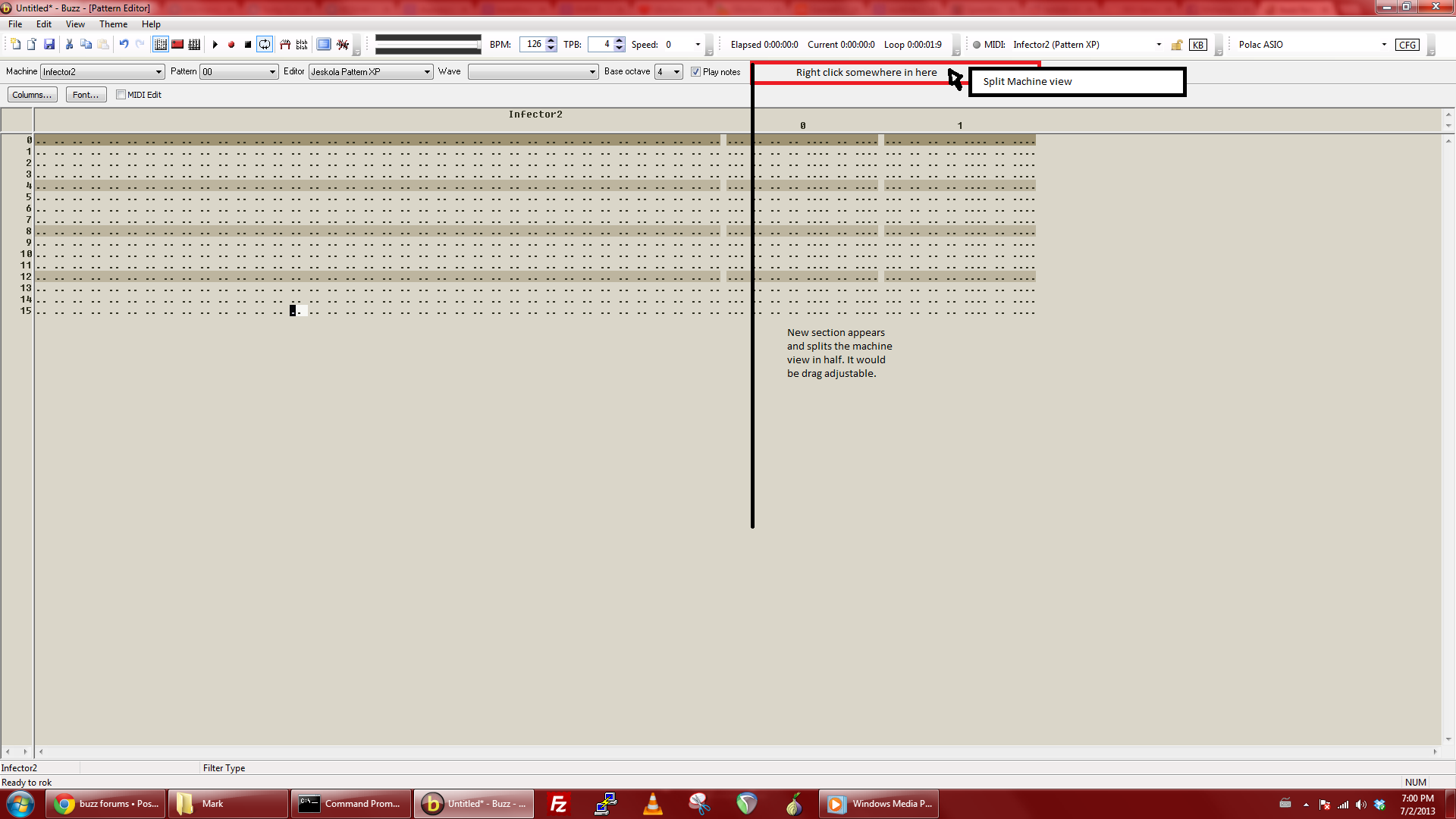 Ok, so I set up 2 patterns. Pattern 00 and pattern 01. Pattern 00 has Bass 3 and Infector.