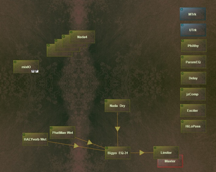 The HALYverb and the PhatMan are rightclicked to be wireless and connected to the mixIO, while the Nada Dry is for the dry part of input.